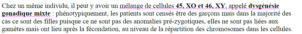 Pcq par la suite on justifie ça par "puisque ce ne sont pas des anomalie pré-zygotique...." mais ça semble pas répondre à la question pq ce sont des filles... selon moi ça explique seulement que + cette anomalie a lieu tôt dans la division de l’embryon (à 4, 8 ou 16 cellules), plus les conséquences sont importantes. On obtient un fœtus avec des cellules 46XY et des cellules 45X0
