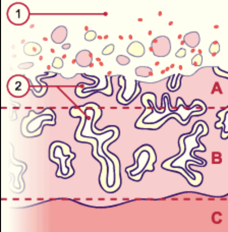 3 couches (basale, spongieuse et compacte),