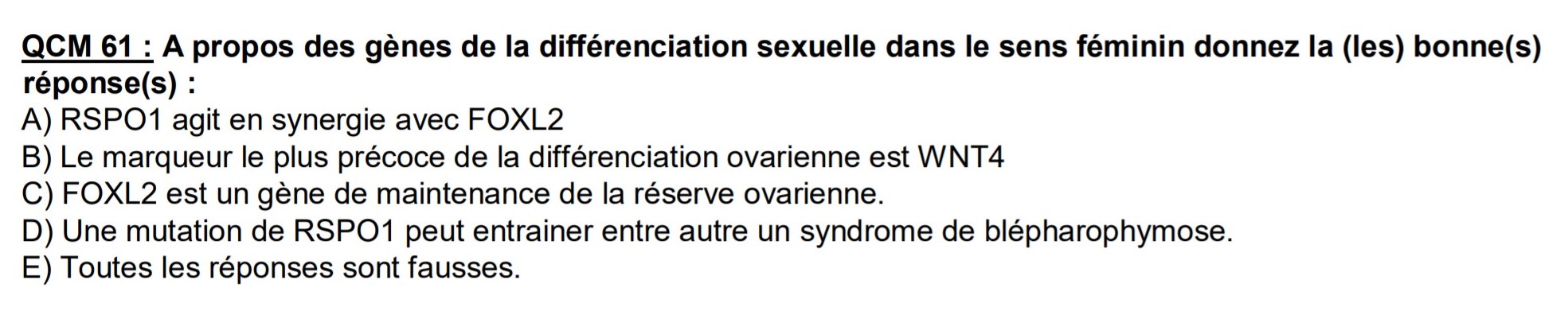 je ne comprend pas pourquoi l'item A est compté juste alors que dans la ronéo il est marqué que RSPO1 n'agit pas seul il a besoin de FOXL2 (alors est-ce qu'il a aussi besoin de WNT4 ou alors est-ce que c'est les cours du professeur Fenichel et Chevalier qui diffère et qui explique la correction?)