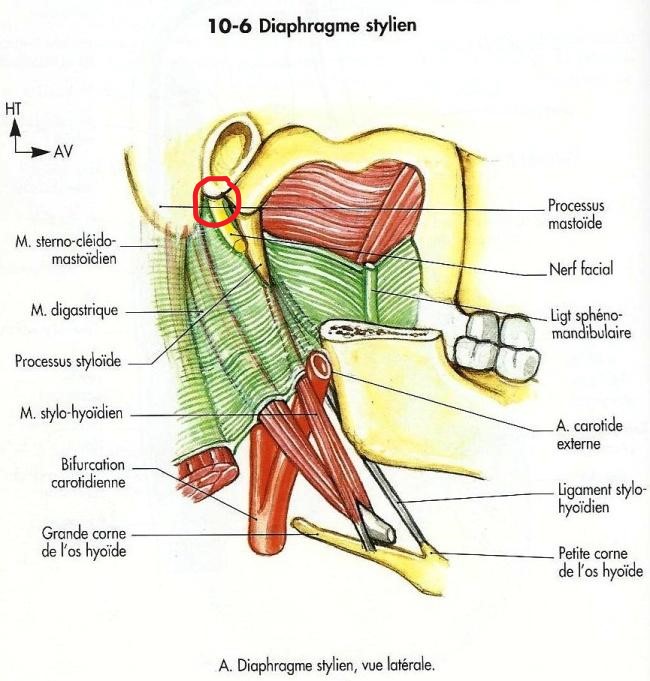 je n'arrive pas a visualiser comment le nerf facial peut perforer le diaphragme stylien étant donné que l'orifice stylo-mastoidien est au dessus du processus styloide ? Et que le VII va avoir un trajet anterieur pour perforer directement la parotide.