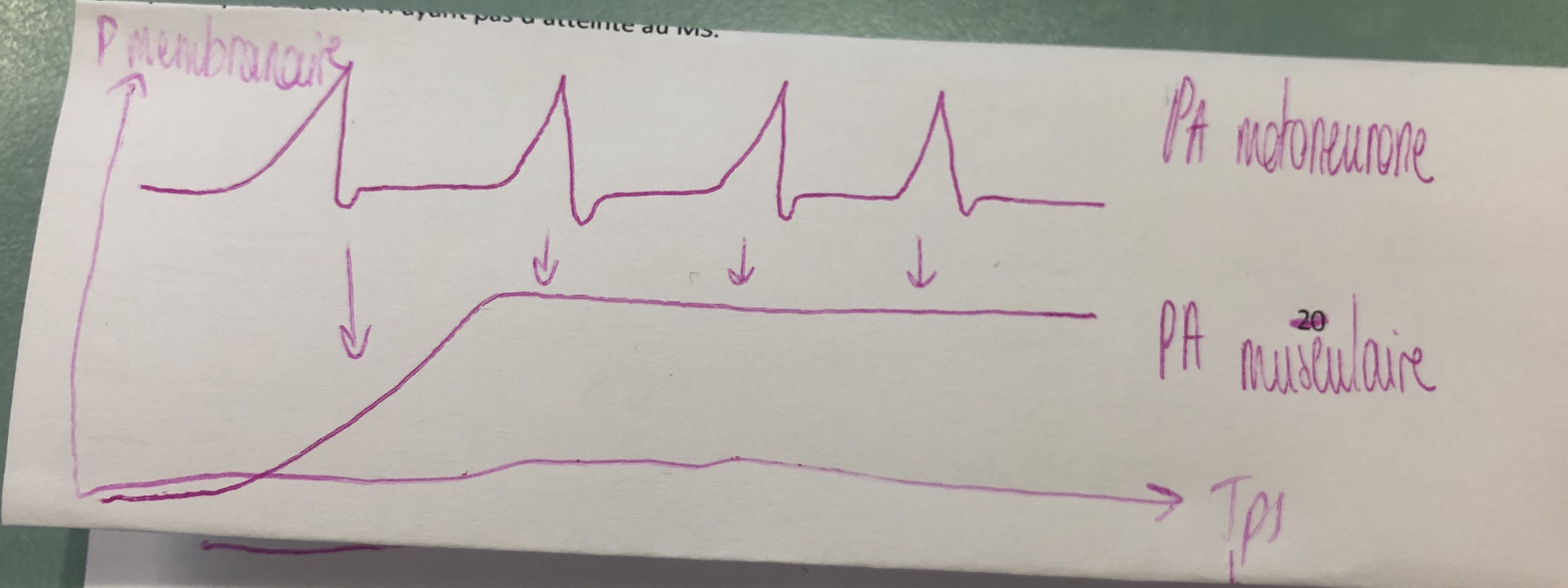 PS : Si le PA du motoneurone était plus long que celui du muscle il ne pourrait pas dépolariser en continu la cellule musculaire puisque le PA musculaire finirait avant et la membrane du rhabdomyocyte aurait le temps de revenir au potentiel de repos avant un nouveau PA du motoneurone