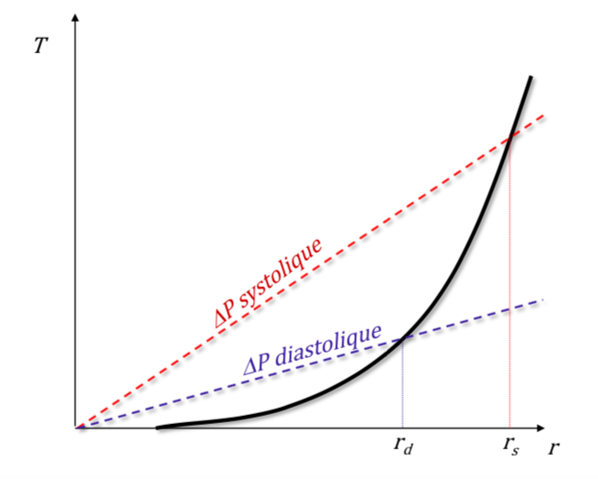 En mixant les 2 expressions graphiques, on retrouve le graphe que tu as joint où on peut voir qu'il existe un rayon d'équilibre. Celui-ci étant plus élevée lors de la systole cardiaque que lors de la diastole.