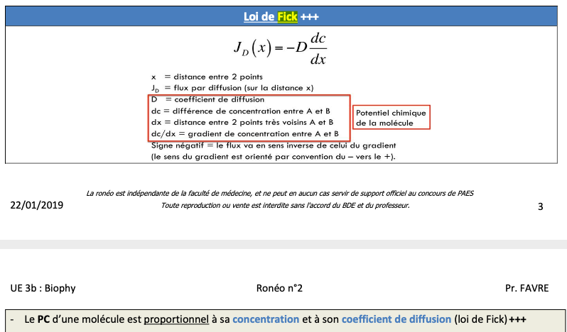 "Donc le PC (potentiel chimique) c’est D(coefficient de diffusion) x le gradient de concentration et il y a un signe négatif devant car le FLUX va en sens inverse de celui du GRADIENT (le sens du gradient est orienté par convention du – vers le +)"
