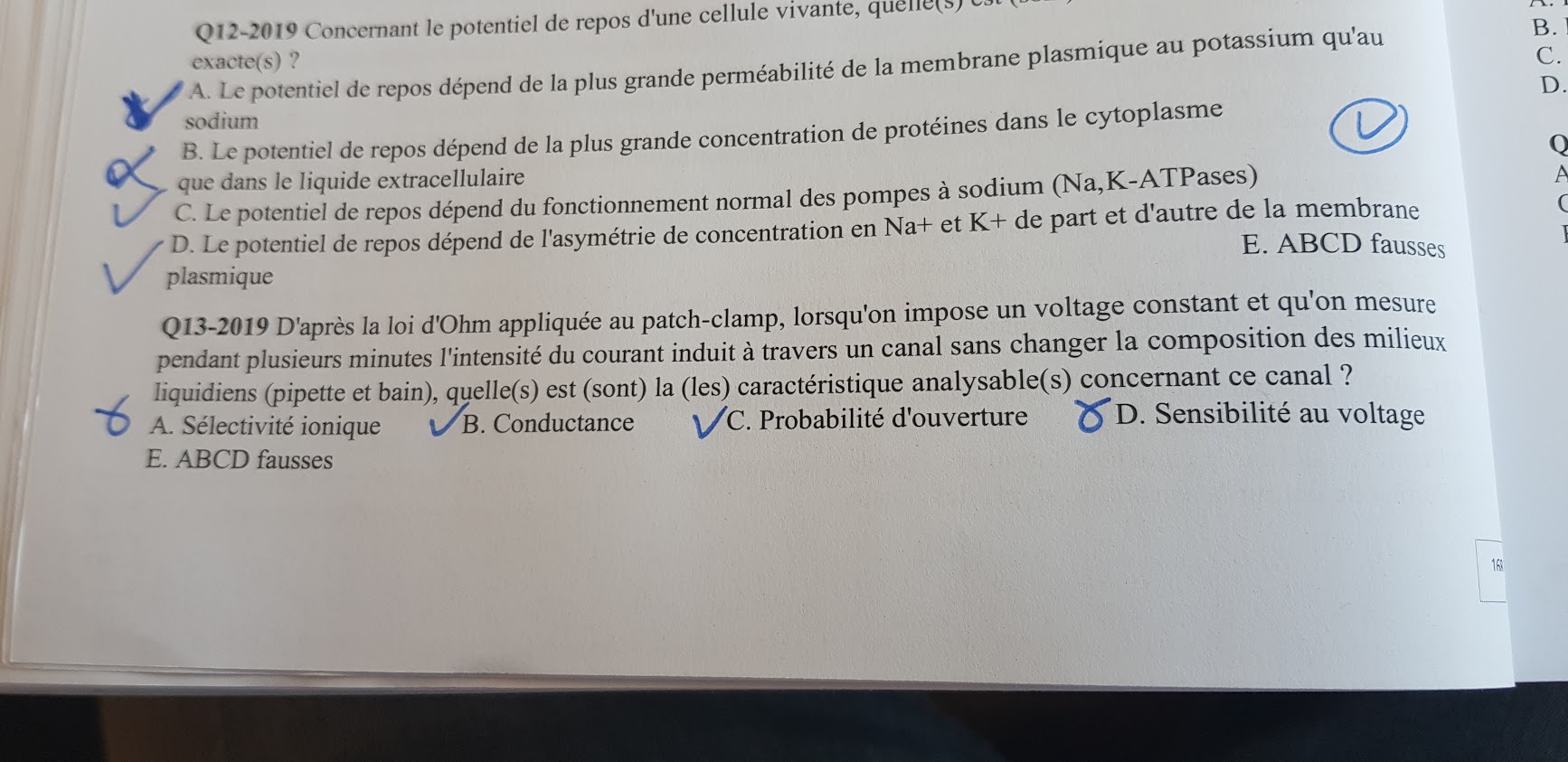 QCM 13 : en fait, qu'on change ou pas la solution dans la pipette et dans le bain on peut tester la sélectivité ionique du canal à l'ion présent dans la solution. Si le courant ne passe pas malgré le voltage, alors le canal n'est pas perméable à l'ion (et donc pas spécifique de l'ion) et dans le cas contraire il l'est.