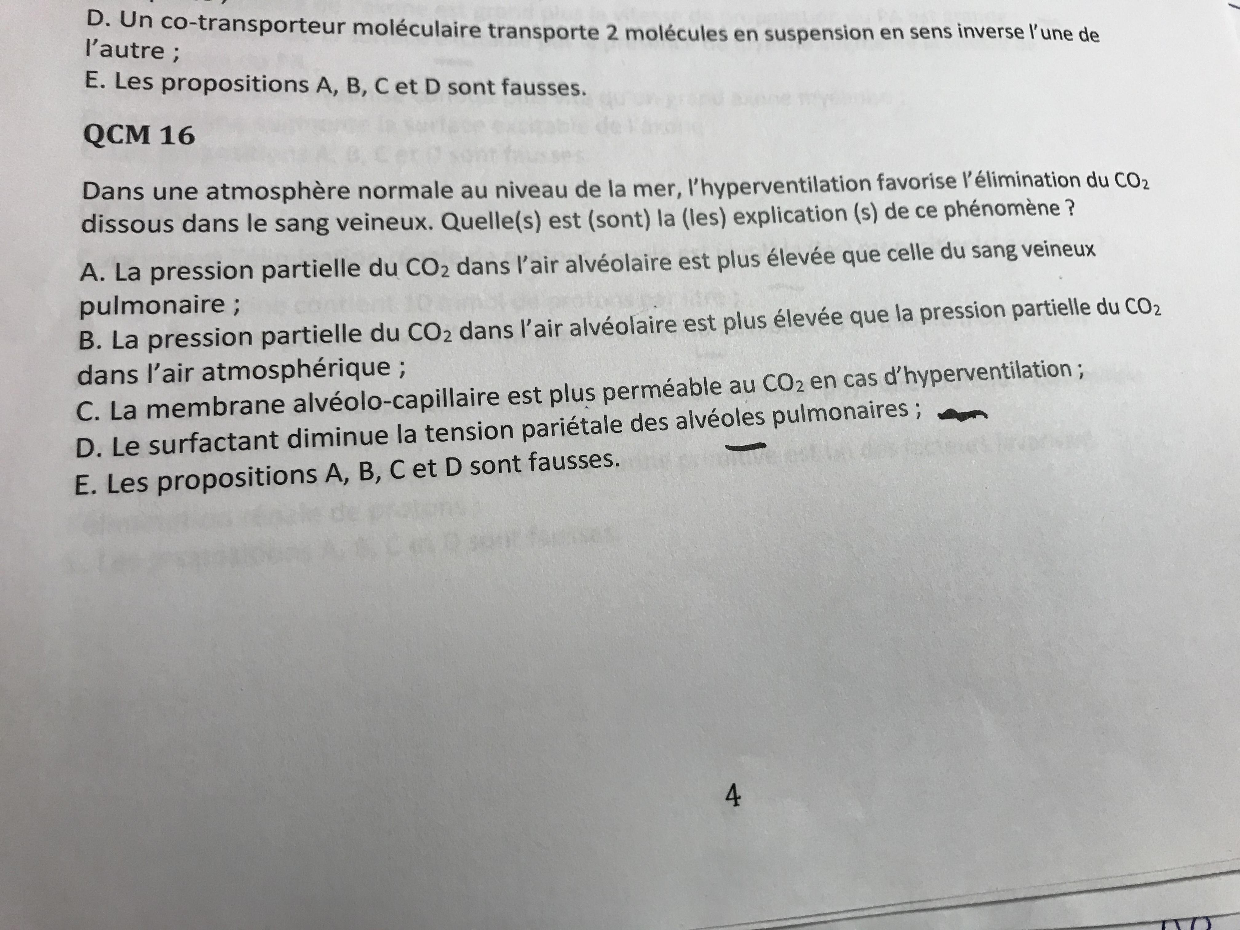 j'ai mis l'item B VRAI car je pense que c'est justement le fait que la pression partielle du CO2 dans l'air atmosphérique soit + basse que celle dans l'air alvéolaire, que du coup quand on hyperventile, la pression partielle de CO2 dans l'air alvéolaire peut alors baisser, et donc favoriser l'élimination du CO2 dissous dans le sang veineux