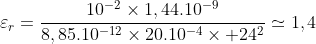 - Quelle est la permittivité relative d'un diélectrique se trouvant entre les 2 armatures d'un condensateur sachant que ce condensateur emmagasine une énergie de 1,44 nJ sous une tension de 24V sachant que :