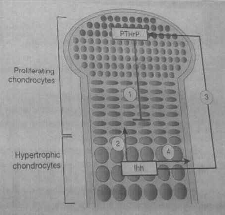 Alors déjà, ce schéma illustre la prolifération des chondrocytes et leurs différenciations en chondrocytes hypertrophiés qui est géré par deux facteurs : IHH et PTHrp