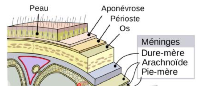 Alors comme tu as sûrement du le voir dans le cours sur le tissu osseux, la périoste entoure tout l'os donc même s'il n'est pas schématisé ici, il y a bien du périoste entre l'os du crâne et la dure-mère !