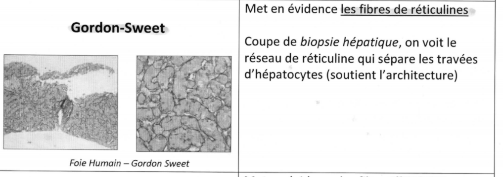 Sur l'image tiré de la ronéo ci contre, tu vois que c'est une coupe de biopsie hépatique, où on remarque des fibres de réticulines qui séparent les hépatocytes
