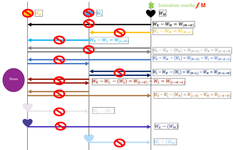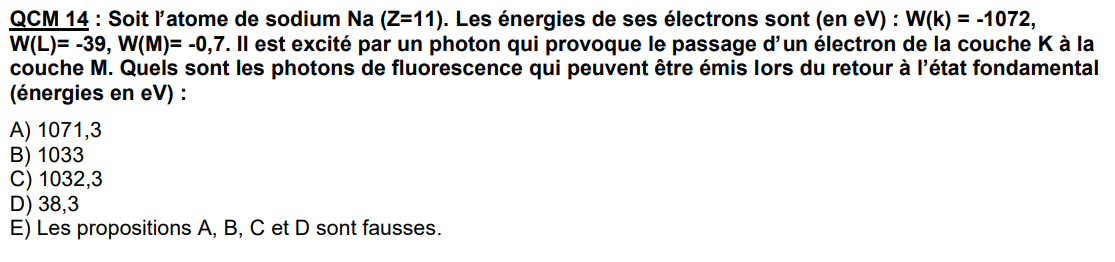 Je bug complétement sur ce QCM, je ne comprends pas pourquoi on ne prends pas en compte la réponse C : Si l'électron de la couche M passe par la couche L puis par la couche K ça donnerais 1072 -39 - 0,7 non ? ^^