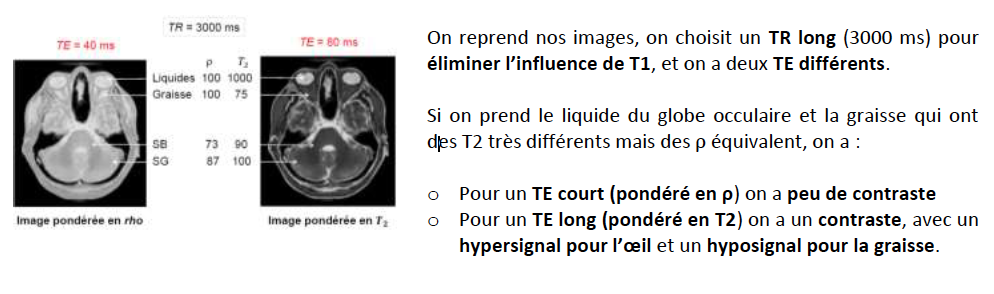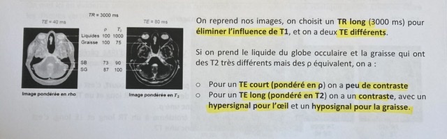 Tout d’abord on nous dit que TE= 40ms est un TE court or il est supérieur à 30ms... de plus normalement pour un TE court le contraste entre tissus à p élevé/faible est important or ici on nous dit qu’on a peu de contraste...