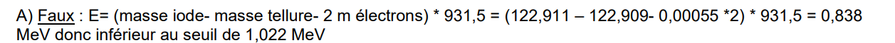 - ou la 2 : ( masse père - masse fils )*931.5 et on vérifie que c'est > 1.022 Mev