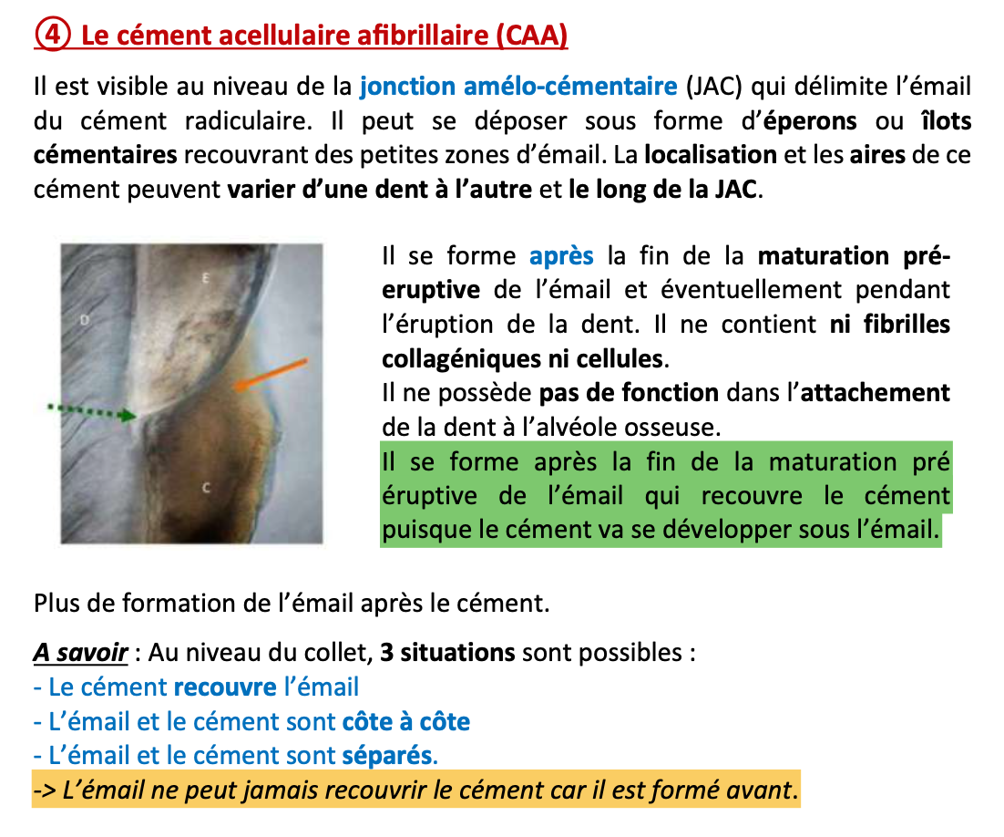 Il est dit que : "le cément (acellulaire afibrillaire) se forme après la fin de la maturation pré éruptive de l’émail qui recouvre le cément puisque le cément va se développer sous l’émail", mais 3 lignes plus bas il est aussi noté que "l'email ne peut jamais recouvrir le cément car il est formé avant".