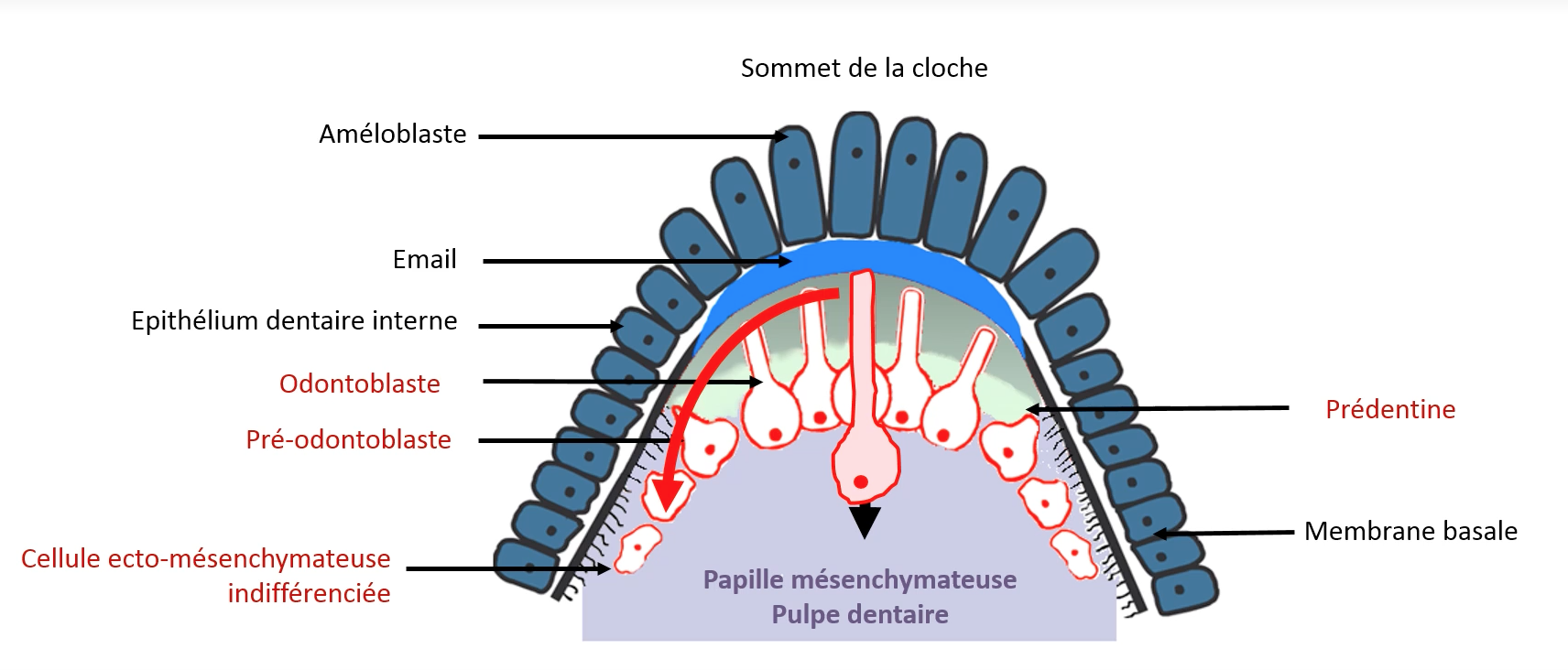 L'item B du QCM8 : "B) Les Odontoblastes sont plus différentiés en Apical qu’en Cervical" est compté faux, je n'arrive pas à comprendre pourquoi puisque comme montré sur le schéma, la prof dit que la différentiation commence au sommet et se dirige vers la zone cervicale. Peux-tu m'éclairer ?