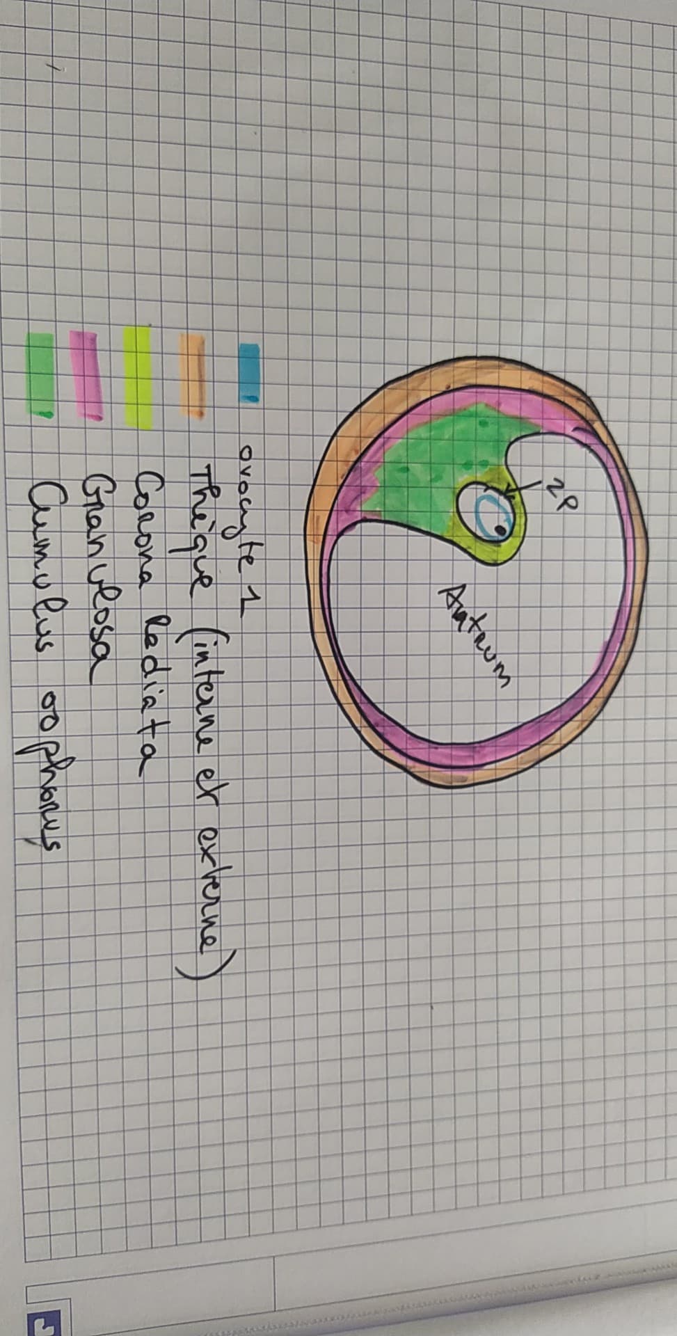 J’ai un peu (bcp) de mal à visualiser où se situe chaque couche cellulaire dans le follicule pre-ovulatoire. Est ce que la granulosa est composée de la corona radiata et des cellules du cumulus ou ce sont vraiment 3 couches à part ? La corona radiata se situe entre l’antrum et la thèque interne ? Etc...