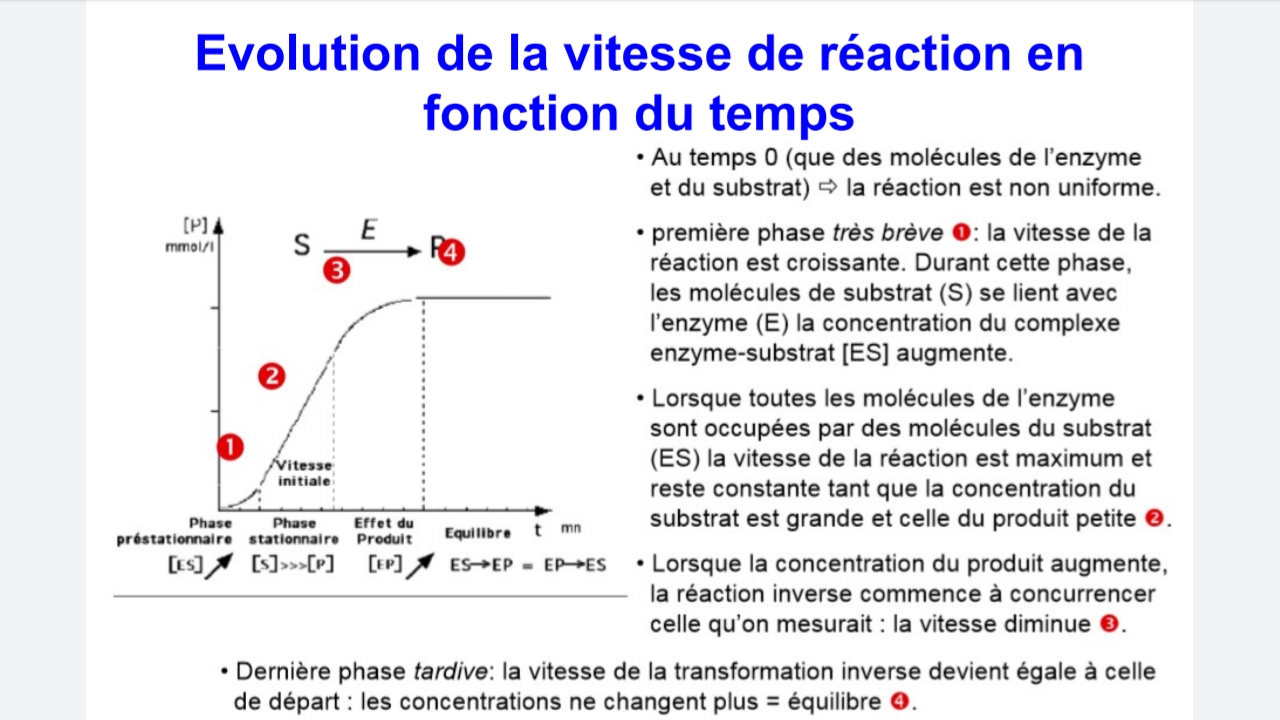 durant la dernière phase, ou l'équilibre est atteint, peut on considérer que la vitesse de formation du produit est nulle car on ne forme plus de produit, ou alors on à atteint l'équilibre (plus rapidement grâce à l'enzyme) et la vitesse de formation est égale à la vitesse de dissociation ? je ne sais pas quel raisonnement est juste, merci de m'éclairer :)