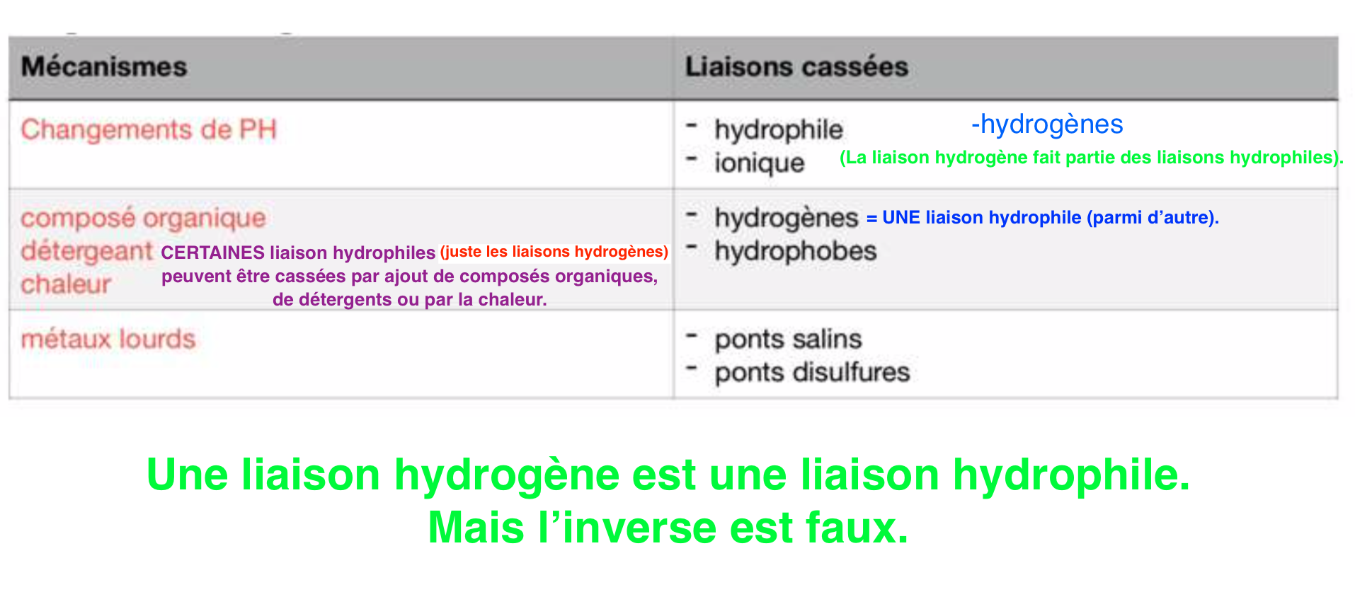 • changement de pH --> liaisons hydrophiles & ioniques;