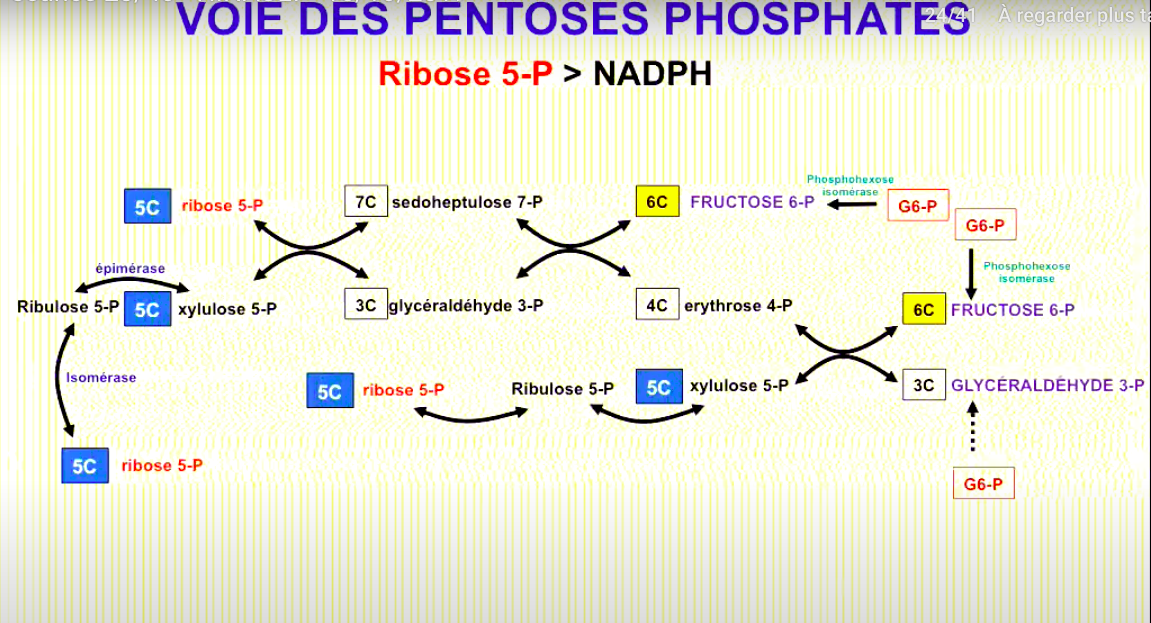 Alors en fait, quand on produit du ribose 5-P à partir de glucose 6-P on passe par la voie oxydative qui se fait donc en plusieurs étapes.
