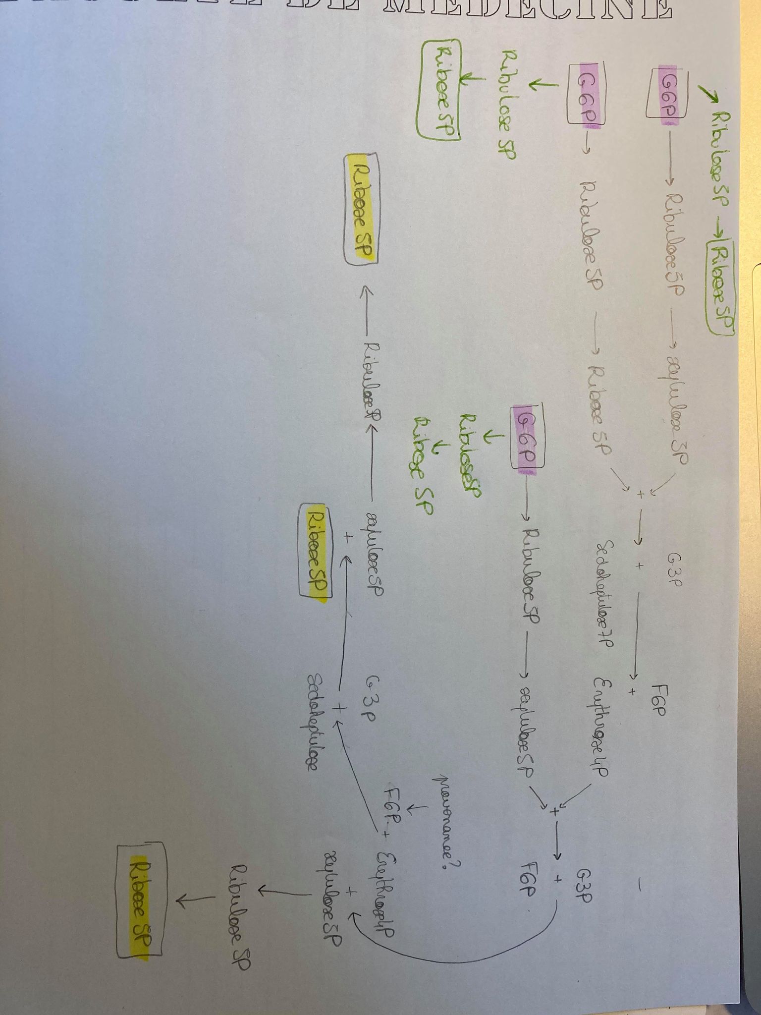 En fait je ne comprend pas pourquoi on va jusqu'a la production de F6P+ G3P (crayon gris sur mon schémas) pour après refaire le chemin inverse alors qu'on pourrait produire 3 molécules de Ribose5P directement à partir du G6P (les voie verte sur mon schémas) sans faire toute la voie allé-retour.