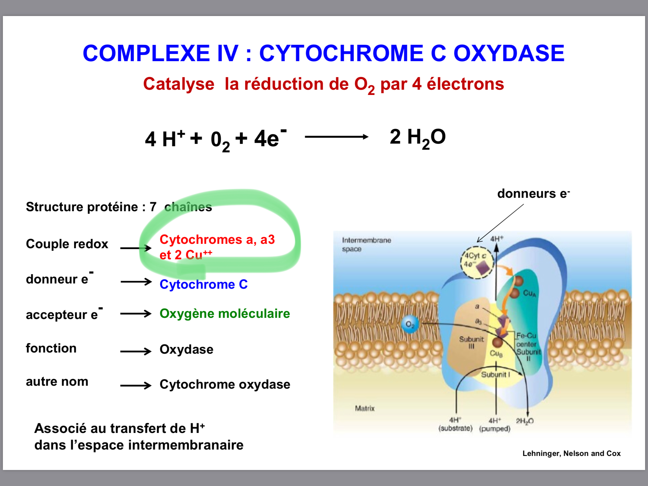 "Dans le complexe IV, le transfert des électrons sur cytochrome a et a3 est associé à deux atomes de cuivre Cu2+ "