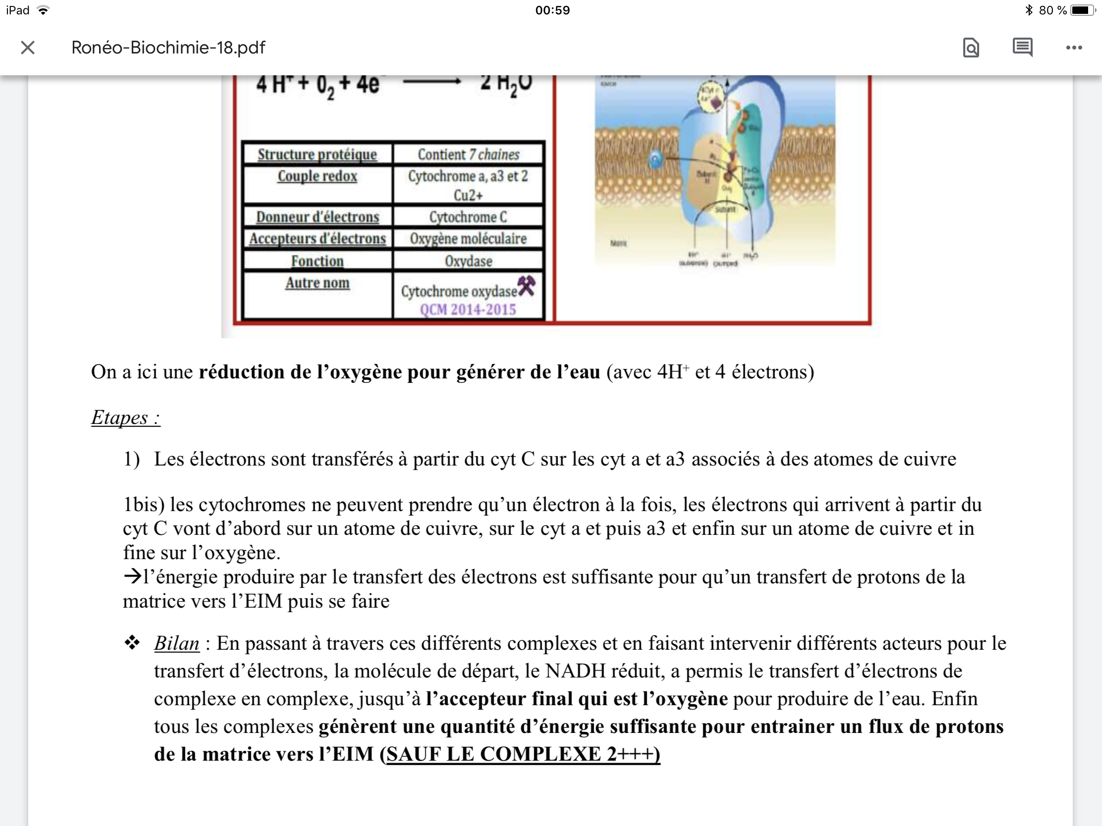 :arrow: Tu nous dis que Les électrons sont transférés à partir du cytochrome C sur les cytochrome a et a3 associés à des atomes de cuivres. On comprend ici que on parle de manière générale, oui on utilise du Cu2+ pour transférer les électrons du cytochrome C à Ca ( Cytochrome C puis Cu2+ puis Ca puis Ca3).