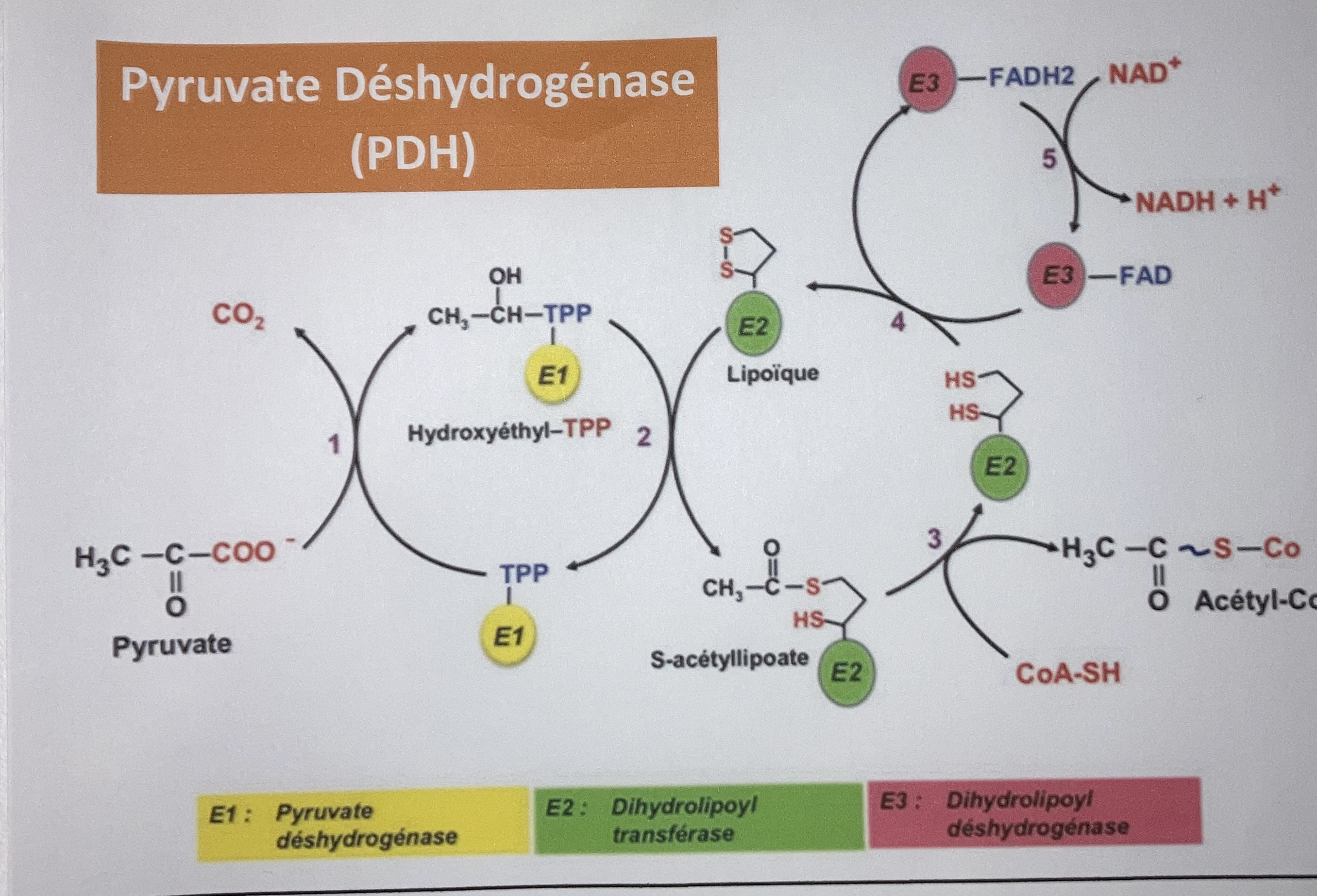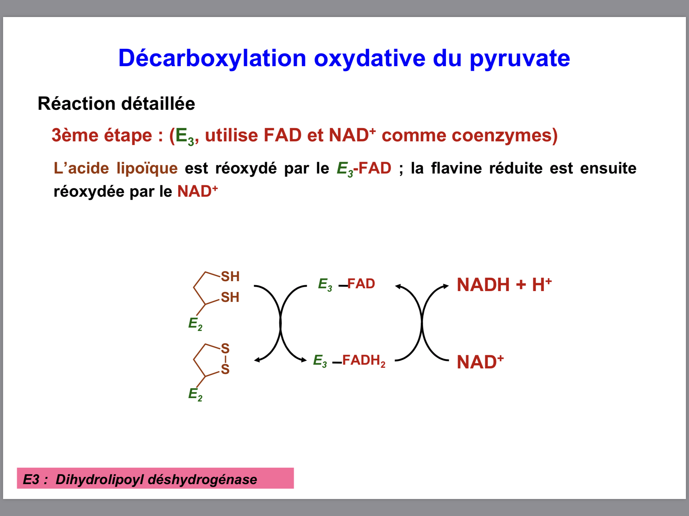 Effectivement, louloute a raison ! En fait la 3ème et dernière étape de la Décarboxylation oxydative du Pyruvate est composé de plusieurs réactions, à commencer par la réoxydation de l'acide dihydrolipoïque ! Cette réoxydation est permet grâce à la réduction du FAD en FADH2, qui sera à son tour réoxyder grâce à la réduction du NAD en NADH (qui partira se réoxyder dans la CRM).