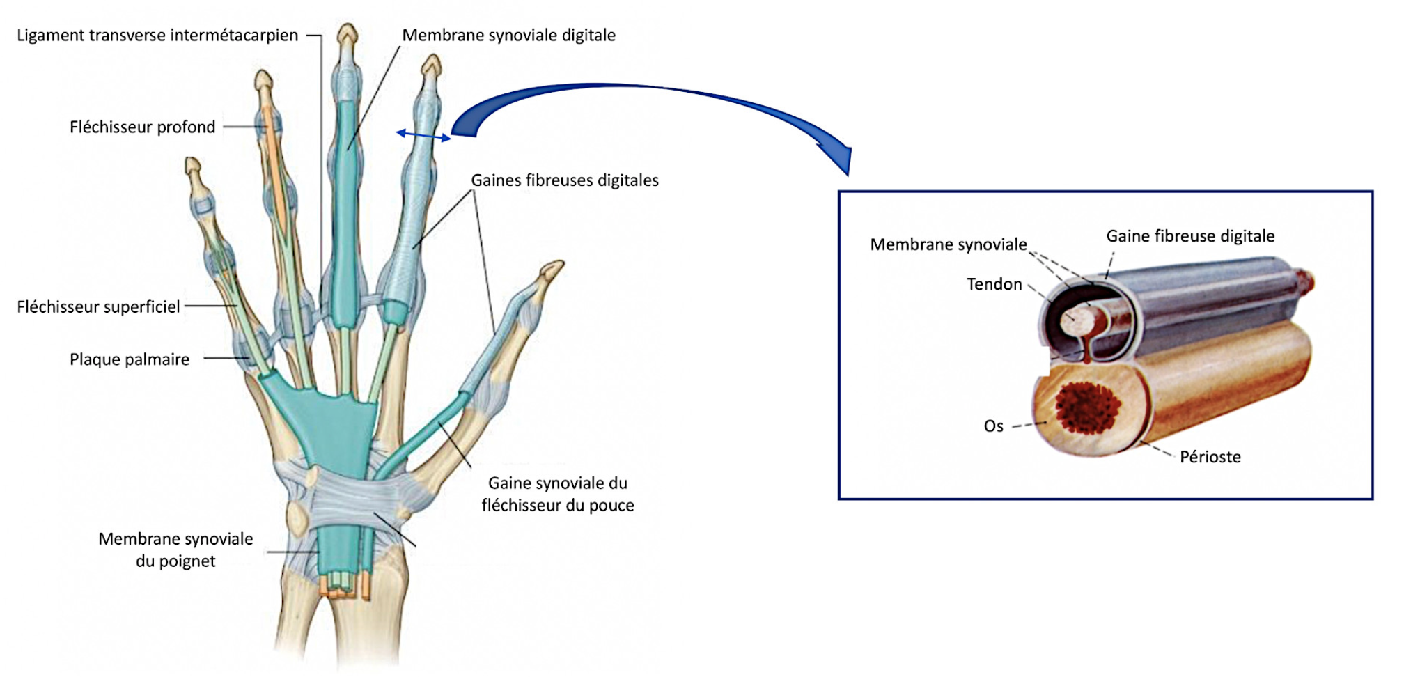 Je n'arrive pas trop à comprendre la différence entre les gaines séreuses et les gaines fibreuses. J'ai compris que les séreuses étaient au niveau des doigts, et permettent au tendon de glisser, mais pour les fibreuses, il est dit qu'il y a des poulies de réflexion et qu'elles empêchent le tendon de s'éloigner du muscle, mais j'ai du mal à visualiser. Est-ce qu'il serait possible d'avoir un récap ?