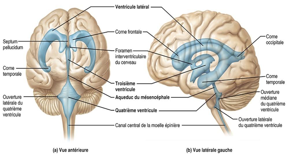 LCS produit par les plexus choroides présent sur la paroi des ventricules. Tu le vois bien sur ce schéma, l'aqueduc est situé sur la face postérieure du mésencéphale (d'où "aqueduc du mésencéphale")