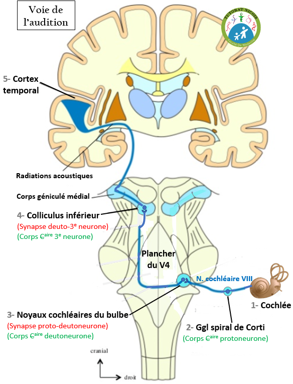 protoneurone de l'audition (le nerf VIII cochléaire) en direction du