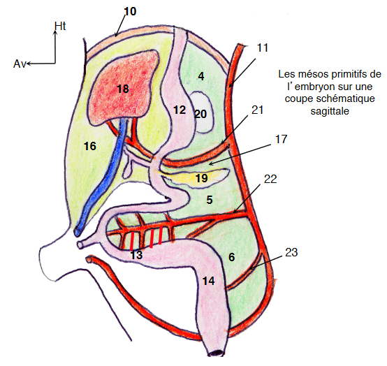 4 : mésogastre / 5 : mésentère / 6 : mésocôlon