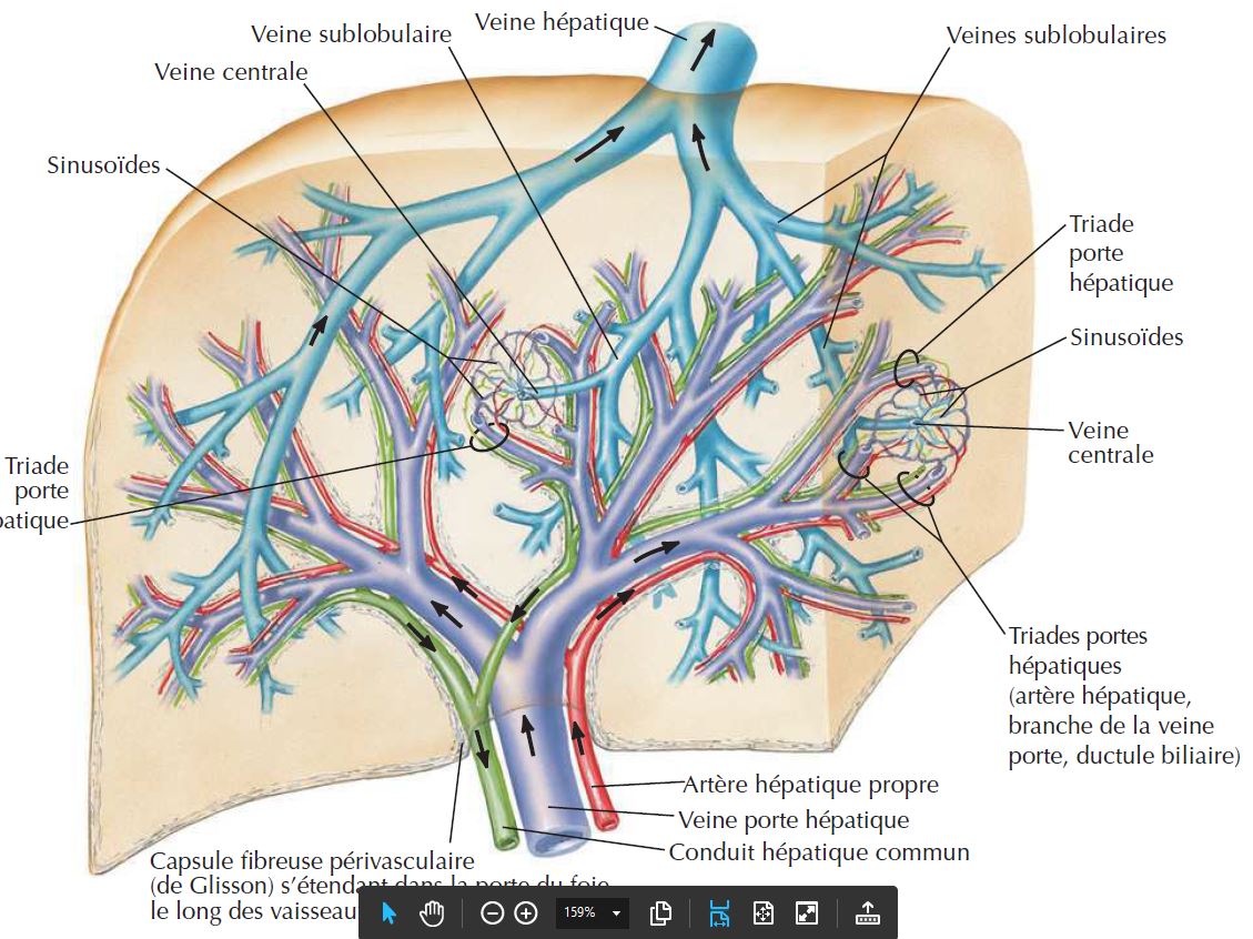 Baqué cite ce système capillaire au sein du foie, qui sera le siège de la filtration du sang veineux (au niveau des hépatocytes) provenant du TD et amené par le tronc porte. Une fois filtré ce sang est récolté dans les veines hépatiques > VCI > coeur droit...