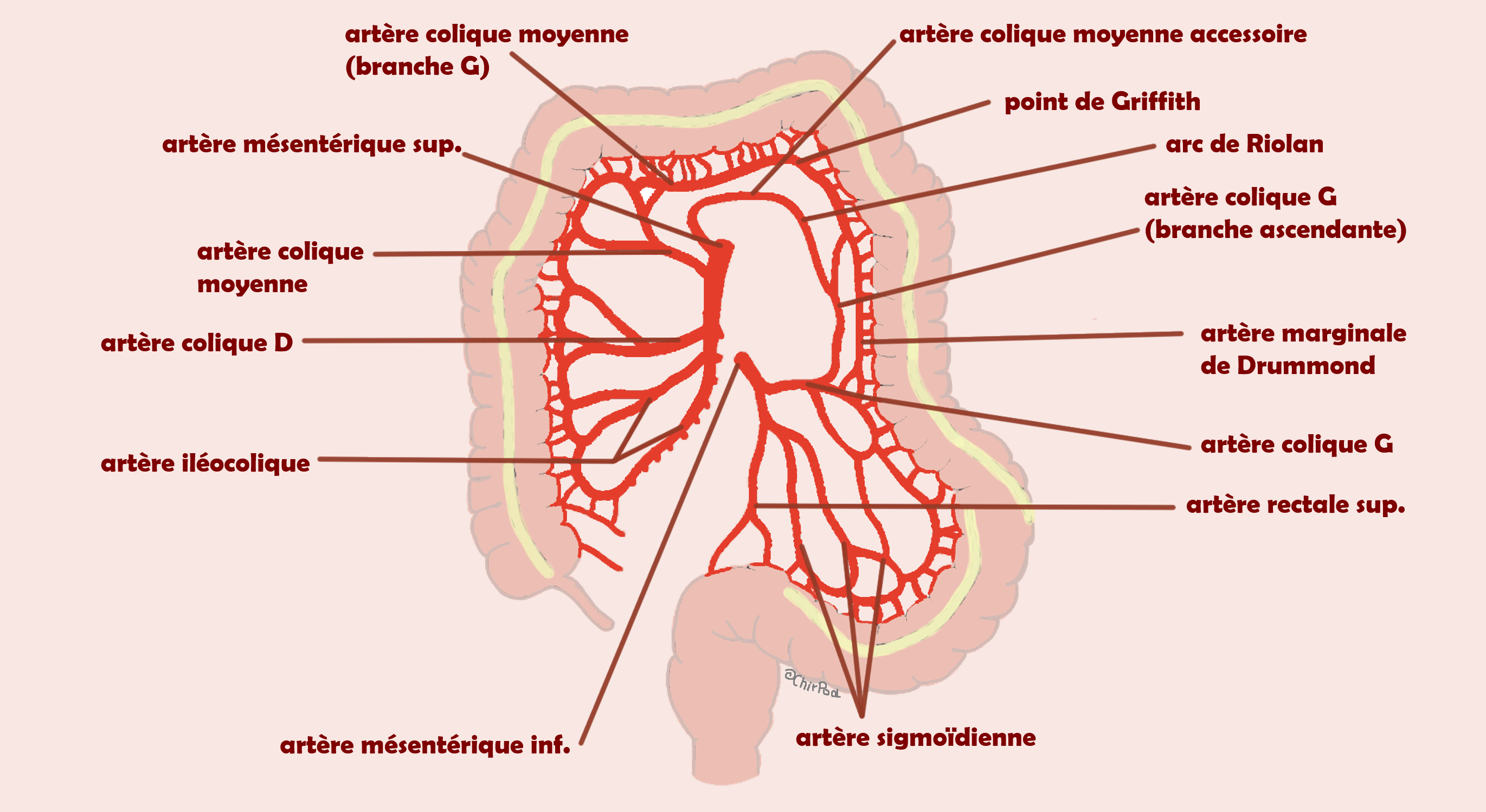 Désolée de revenir sur le sujet mais je ne suis pas sûre d'avoir compris pourquoi on dit que l'arcade de Riolan est une portion de l'arcade bordante du colon. D'après le schéma, on voit bien ce que dit le prof : l'arcade de Riolan est la jonction entre l'artère colica media et l'artère colique gauche : ça permet de faire le lien entre l'AMS et l'AMI