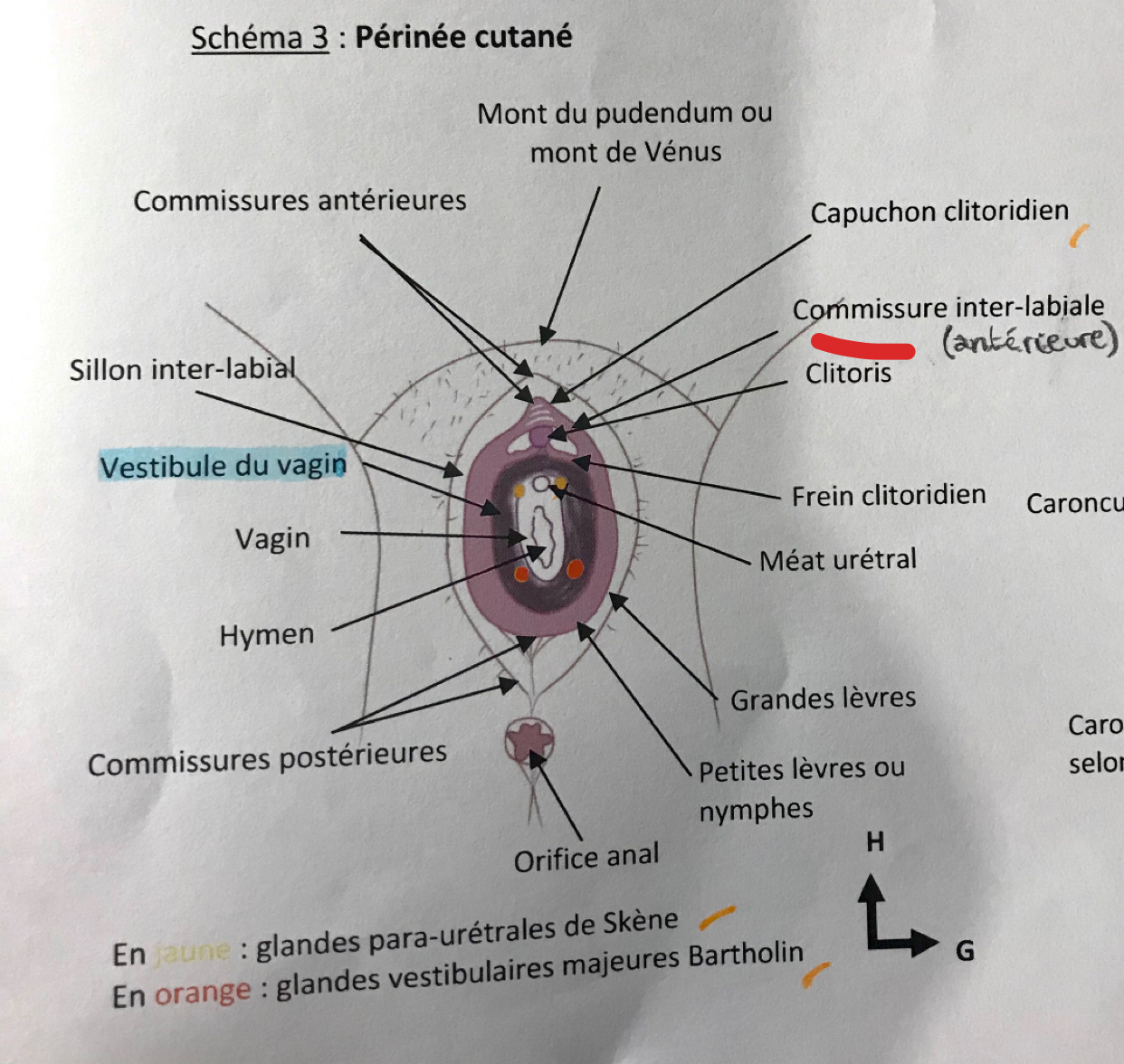 Dans le cours on nous dit que les petites levres délimitent la commissure inter-labiale antérieure. Je n'arrive pas vraiment à distinguer ce que c'est sur le schéma car on voit que c'est différent du "sillon labial = inter-labial" qui sépare grandes et petites levres, et différent de la "commissure antérieure des petites levres" ou celle des grandes levres. Est-ce que tu m'expliquer à quoi ca correspond stp ? un petit schema serait pas de refus aussi