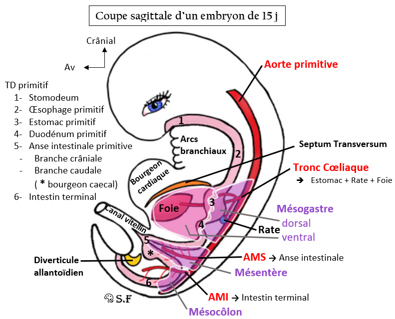 -> le mésentère relie l'anse intestinale primitive (future intestin grêle + côlon droit) à la paroi postérieure & véhicule l'AMS