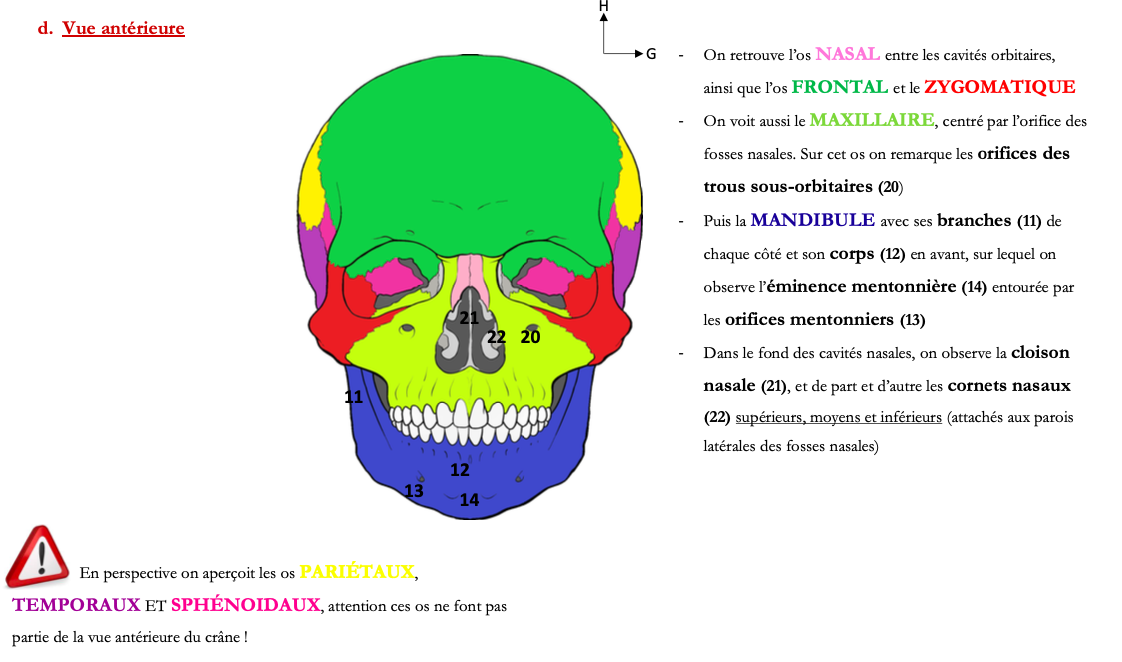 :arrow: Il insiste sur le "vue antérieure" (vraiment que les os qui sont sur le plan le +antérieur en 2D), on ne voit pas les articulations qui vont être en arrière, en dedans; donc l'os frontal en arrière et l'éthmoide on oublie (même si généralement c'est vrai, ici on ne voit pas ces articulations)