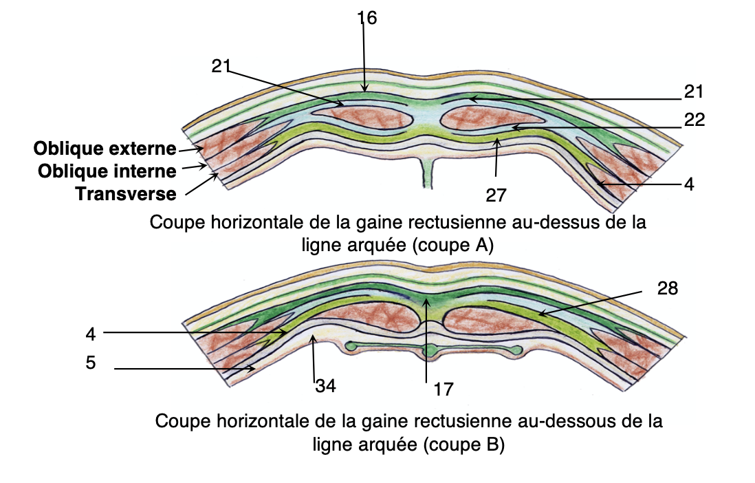 À ce niveau, le transverse et le feuillet postérieur de l'oblique interne passent en arrière de grands doigts et forment la paroi postérieure de la gaine rectusienne. Le péritoine et le fascia sont en arrière de ces muscles mais ne font pas partie de cette paroi.