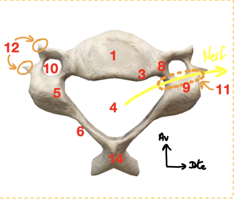 Je m'explique : dans le cours, il est bien précisé que le nerf spinal passe toujours en arrière des vaisseaux. Cependant, si le numéro 5 est le pédicule et le numéro 11 la gouttière du nerf spinal (l'item C est faux seulement pour le piège de la gouttière concave vers le bas), cela le ferait passer en avant des vaisseaux. De plus, pour moi, le pédicule est situé dans le foramen transversaire donc au niveau du 10 et non du 5, ce qui serait cohérent par rapport à la position du nerf..