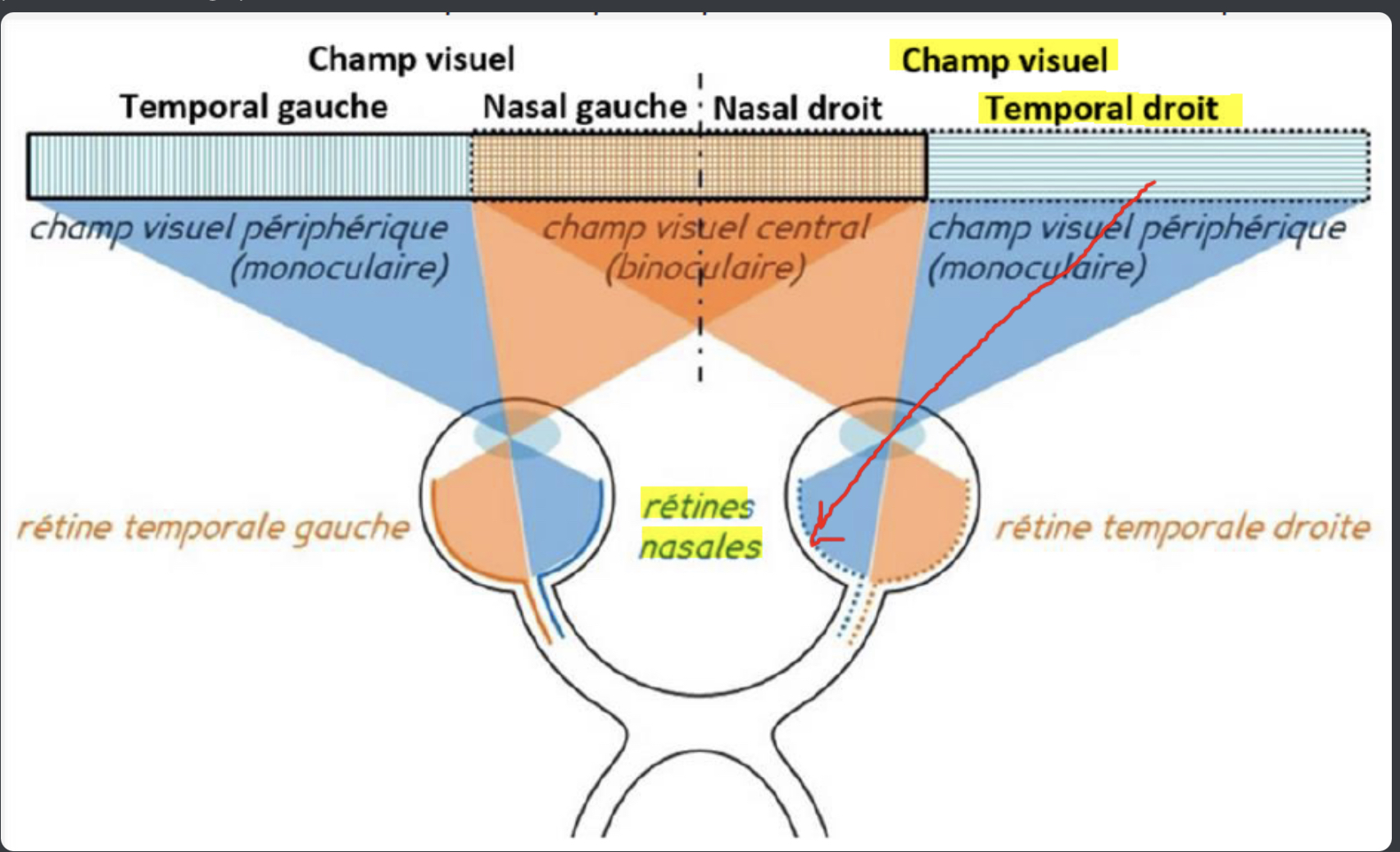 Alors j’ai un petit problème avec ce qcm, la correction marque C et moi j’avais répondu AC... donc c’est que je n’ai toujours pas compris cette histoire de champs visuels et d’hémirétine, pourtant je visualise avec le schéma ci-joint. Serait-il possible de me réexpliquer svp ?