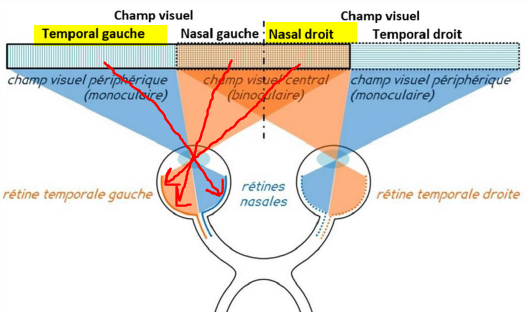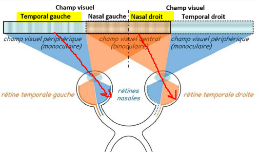 A) Le champ visuel gauche des 2 yeux est perçu par l’hémirétine nasale gauche ainsi que l’hémirétine temporale gauche