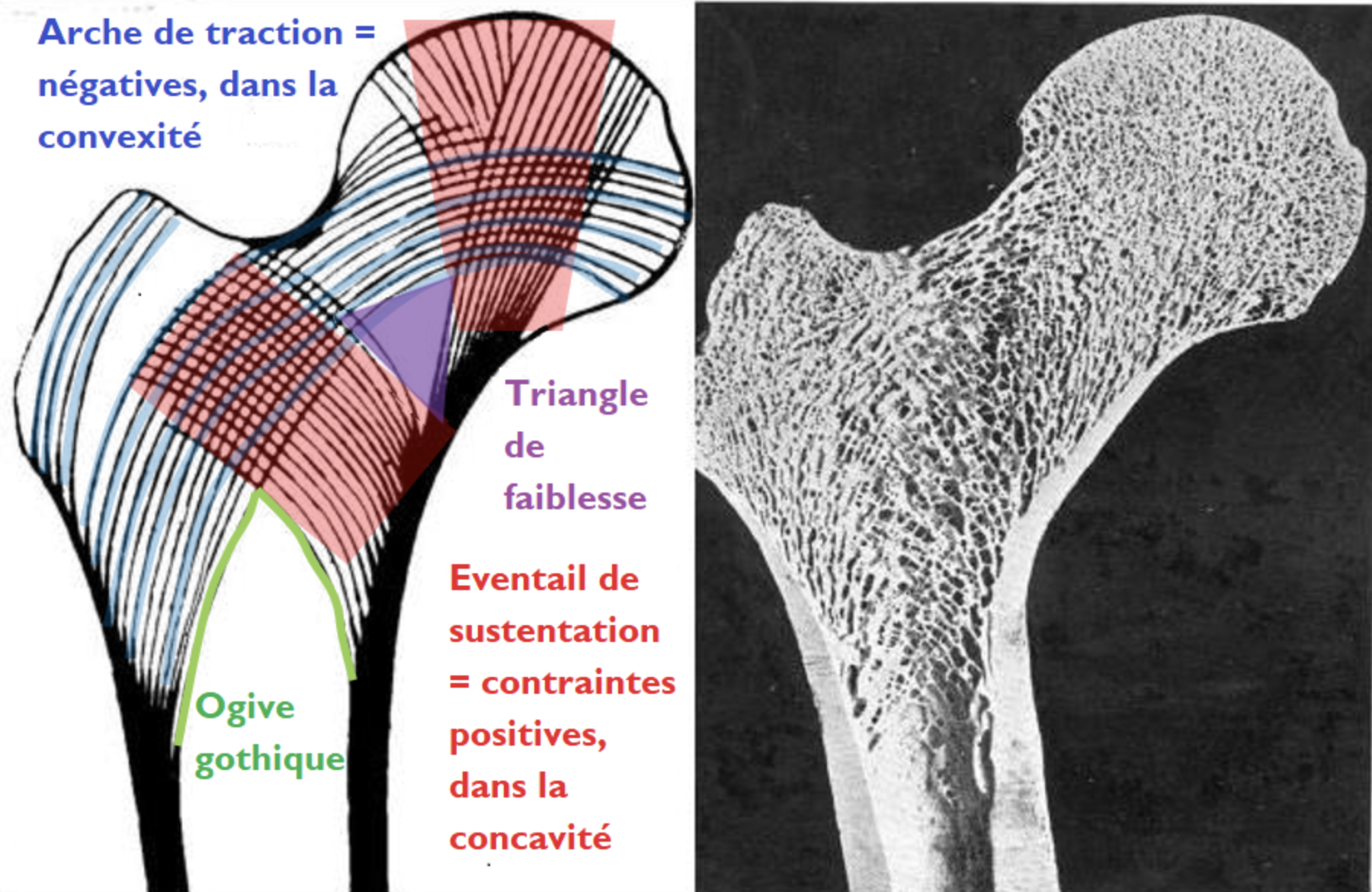 Au niveau de la tête fémorale, les contraintes s'organisent sous forme de travées gothiques en suivant les lignes de force selon la loi de Wolf. T'as raison, il y a des arches de distraction et éventails de sustentation aussi au niveau de la tête mais, quand les lamelles spongieuses se croisent, ça va former l'arche gothique.