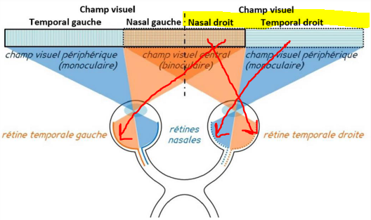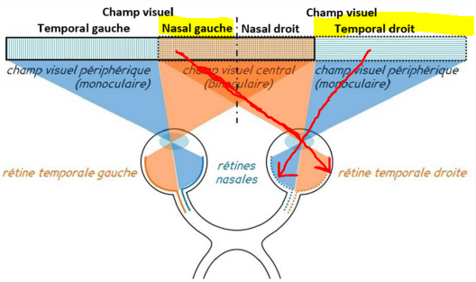 L’item « Le champs visuel droit des 2 yeux est prix en charge par l’hémi rétine nasale de l’œil droit ainsi que l’hemi rétine temporale de l’œil gauche » est compté juste mais je comprend pas trop.