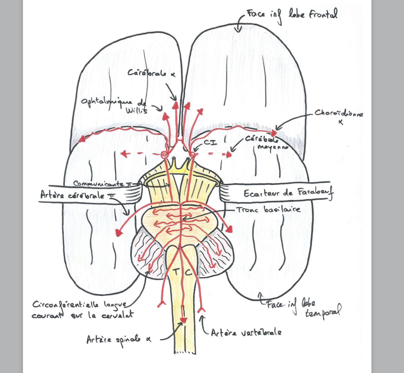 :arrow: La première choses est, comme tu dis, le tronc basilaire est sur le métencéphale et se divise au dessus en cérébrale post, donc le fait qu'il entoure le mésencéphale concorde avec ça