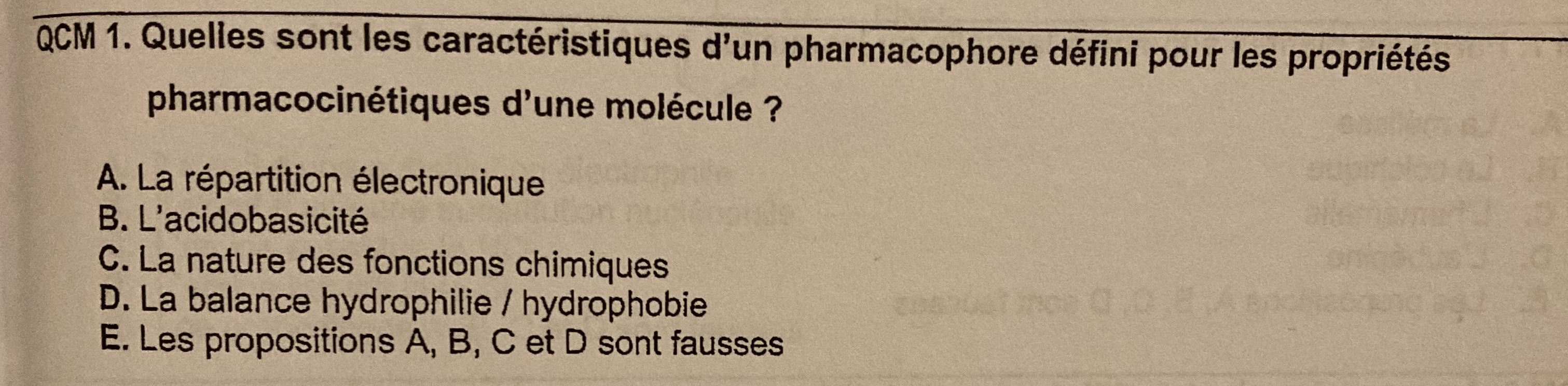 J’ai une petite question concernant la question 1 de chimie thérapeutique des annales 2019 sur les propriétés pharmacocinétique d’un pharmacophore. Dans la correction officieuse ils disent que c’est la réponse E, mais je ne comprend plus rien: elles sont pas définies par le caractère acidobasique et la balance hydrophilie hydrophobie ??