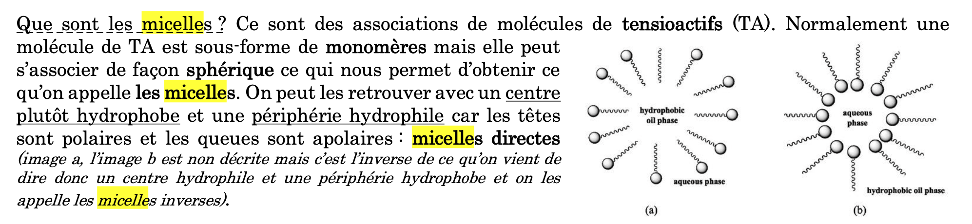 Salut, je ne comprend trop la correction de l'item, j'ai regarder le cours du prof et a l'oral il dit uniquement que les micelles sont hydrophobe à l’intérieur et hydrophile à l’extérieur (micelle direct), par contre dans ça diapo il marque micelle inverse mais développe pas l'oral et son schéma est en anglais du coup je peux avoir quelques précisions SVP