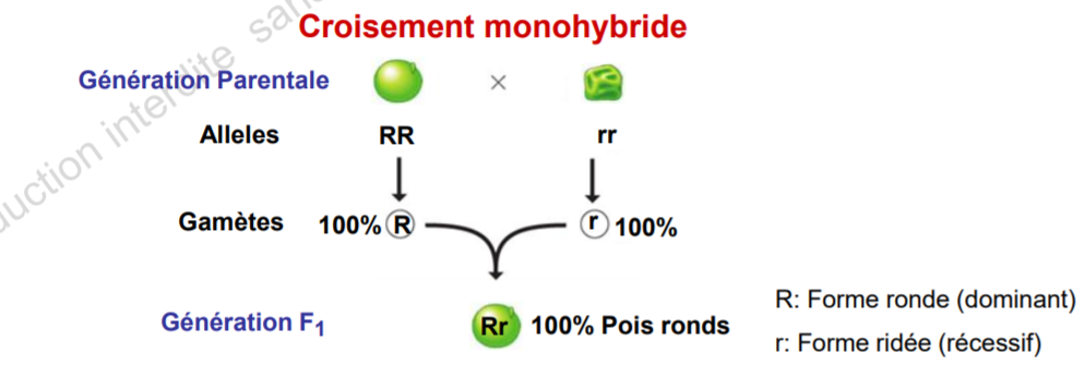 D'abord, notre cher Mendel va réaliser des croisements monohybrides de petits pois. Cela veut dire que les petits pois utilisés n'ont qu'un gène. Ceux de la génération parentale sont des lignées pures dont un ne possède que des allèles dominants et l'autre que des allèles récessifs.