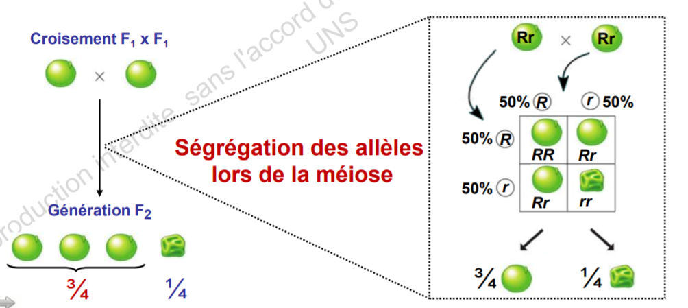 Pour avoir cette multitude de combinaisons d'allèles il faut que ces derniers soient séparés durant la méiose. Par ailleurs tu remarques sur l'image que dans 3 cas sur 4 tu as le même caractère car présence d'un allèle dominant donc la probabilité d'un caractère dépend des combinaisons possibles durant la fécondation. C'est ça la ségrégation des caractères. :wink2: