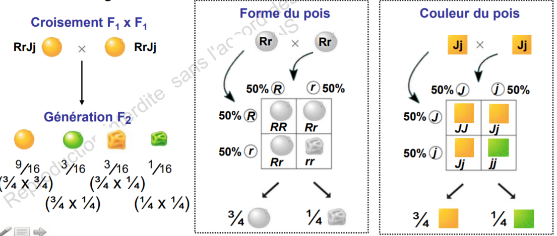 A la génération F1 tu vois que le petit pois possède un alléle récessif et dominant pour chaque gène. Donc il exprime le même caractère que celui qui ne possédait que des gènes dominant.