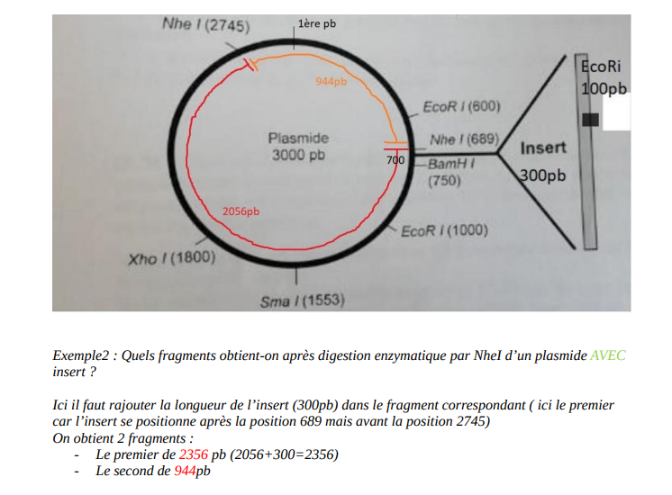 on va reprendre petit à petit. On a sur cette image une digestion enzymatique par Nhe I qui coupe en position 689 et 2745. L'insert s'insert en position 700 donc dans le fragment long qui est en rouge. A partir de ces informations on peut calculer le nombre de pb pour le fragment rouge en soustrayant les extrémités (2745 - 689 = 2056) et en ajoutant l'insert soit 2056 + 300 = 2356 pb.
