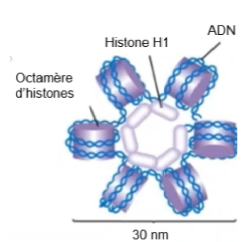 En effet, sur le schéma que je te joins ci-dessous (coupe transversale de l'ADN) on voit bien que 1 tour d'hélice = 6 nucléosomes