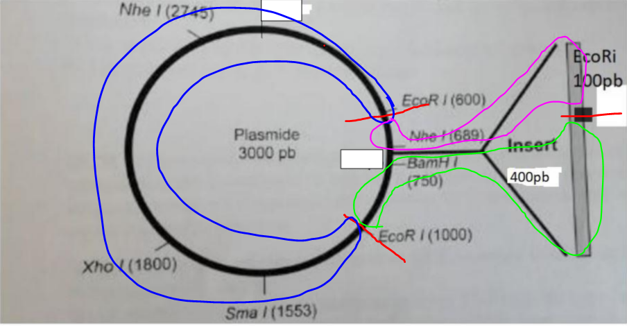 Tu vois ici la coupure sur EcoRI en position 100 en rouge. Cette coupure va séparer l'insert en deux fragments dont un de 100 pb qui va être avec le brin rose et un autre de 300 pb qui va avec le brin vert vu qu'on intègre l'insert dans le plasmide. Car l'item nous demande la taille de chaque fragment en comptant l'insert.